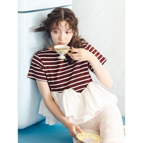 身頃には、しっかりとした肉感のボーダー天竺を使用し、身体のラインを拾いすぎないすっきりとしたシルエットに仕上げています。布帛のような風合いのカットソー生地で作られたバルーンペプラムをあしらったデザイントップスです。クラシカルな雰囲気を持ちながら、ウエストのペプラムが華やかな印象を演出します。すべてカットソー生地を使用しているため、自宅で簡単にケアできる点も魅力です。