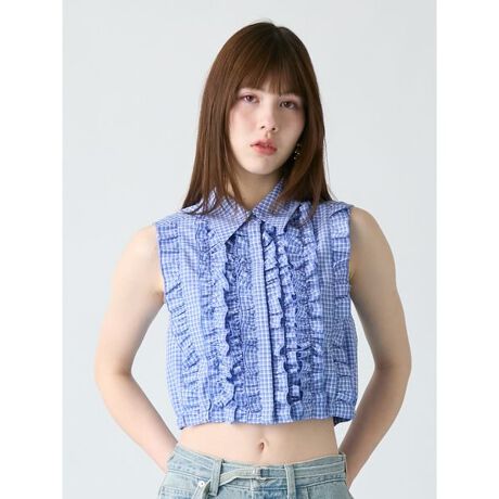 前身頃にフリルを施し、華やかな印象に仕上げたノースリーブブラウスです。裾はゴム仕様の短丈デザインで、肌見せなどさまざまなバランスのコーディネートを楽しめるアイテムです。