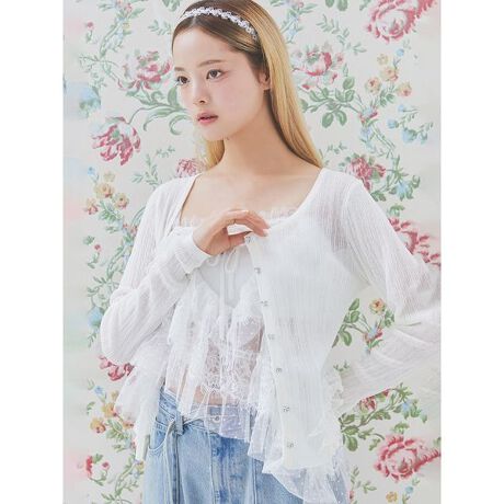 リネン混の細番手糸で編み立てた、軽やかで繊細な表情が魅力のカーディガンです。シアー感のあるランダムリブが肌にほどよくなじみ、真夏でも涼やかな着心地を叶えます。サイドに段々とあしらったフリルペプラムは、動くたびに揺れ、バレリーナのチュチュを思わせる可憐なシルエットに。フロントには小さなビジューボタンを配し、さりげない煌めきをプラスしました。甘さの中に品を残した、大人のフェミニンスタイルに寄り添う一枚です。