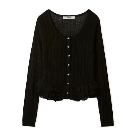 リネン混の細番手糸で編み立てた、軽やかで繊細な表情が魅力のカーディガンです。シアー感のあるランダムリブが肌にほどよくなじみ、真夏でも涼やかな着心地を叶えます。サイドに段々とあしらったフリルペプラムは、動くたびに揺れ、バレリーナのチュチュを思わせる可憐なシルエットに。フロントには小さなビジューボタンを配し、さりげない煌めきをプラスしました。甘さの中に品を残した、大人のフェミニンスタイルに寄り添う一枚です。