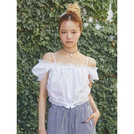 フロントの華奢なリボンやパフスリーブがフェミニンな印象のブラウス。衿ぐりや袖口、裾にはレースをあしらい、シンプルになりがちな夏のコーデも華やかになるようこだわりました。衿ぐりはゴム仕様なので、オフショルダーとしても着用できる2WAY仕様なのも嬉しいポイント。ボリュームのあるスカートやパンツ、コンパクトなボトムなど、さまざまなボトムと合わせやすいブラウスです。