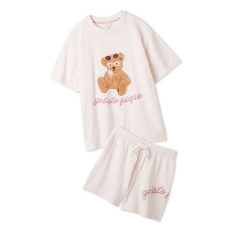 サングラス焼けしたお顔に思わず胸きゅん。夏をめいっぱい楽しむベアをテーマにした、ファミリーやカップルでお楽しみいただけるSUMMER BEARシリーズです。浮き輪でひと休みしたり、アイスを食べているベアをジャガードで大きく描いた半袖プルオーバーと、カラフルなアーチロゴ入りのショートパンツのセットアップ。柔らかな風合いの薄手ニットを使用しているので、エアコンの効いた夏のおうち時間にもちょうど良い組み合わせです。サングラスや浮き輪、ロゴのポップな配色がHAPPYな気分を演出します。色はアイスを食べているベア柄のピンクと、浮き輪に乗ったベアを描いたアイボリーとミントの全3色。HOMME、JUNIOR、KIDS、BABYとリンク・コーディネートしたり、ギフトにもおすすめです。