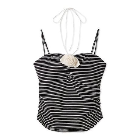 肌触りの柔らかい天竺素材を使用。クラシカルでフェミニンな雰囲気のドット柄と、細めのボーダー柄のカラー展開です。取り外し可能なカップ付きで、一枚でも着用可能。肩紐は取り外しができ、ベアトップとしても着用できる2WAY仕様です。裏地にはゴムを使用してフィット感を高め、安定した着心地に仕上げています。葉付きのコサージュは紐付きで、前身頃中心と左側の2か所のループのいずれかに通して着用可能です。