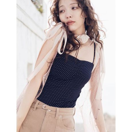 肌触りの柔らかい天竺素材を使用。クラシカルでフェミニンな雰囲気のドット柄と、細めのボーダー柄のカラー展開です。取り外し可能なカップ付きで、一枚でも着用可能。肩紐は取り外しができ、ベアトップとしても着用できる2WAY仕様です。裏地にはゴムを使用してフィット感を高め、安定した着心地に仕上げています。葉付きのコサージュは紐付きで、前身頃中心と左側の2か所のループのいずれかに通して着用可能です。
