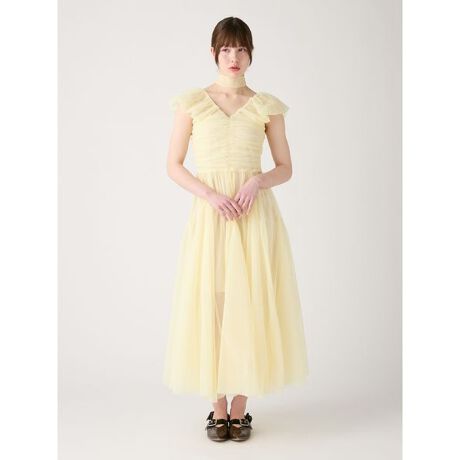立体的なバルーンのようなディティールが目を引くチュールドレスで、上身頃はノースリーブのVネックデザインになっております。左脇にはコンシールファスナーを備え、後ろ上身頃にはゴムシャーリング入りで着脱もしやすくなっております。スカート部分はマチ切替で動きのあるシルエットを演出。取り外し可能なリボンが付いているので、様々な着こなしを楽しめるのも嬉しいポイント。ロング丈で光沢感のあるサテン調の伸縮性裏地が付いた、着心地の良い一着です。