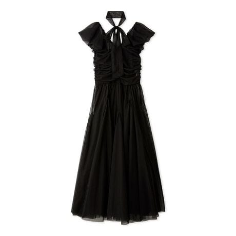立体的なバルーンのようなディティールが目を引くチュールドレスで、上身頃はノースリーブのVネックデザインになっております。左脇にはコンシールファスナーを備え、後ろ上身頃にはゴムシャーリング入りで着脱もしやすくなっております。スカート部分はマチ切替で動きのあるシルエットを演出。取り外し可能なリボンが付いているので、様々な着こなしを楽しめるのも嬉しいポイント。ロング丈で光沢感のあるサテン調の伸縮性裏地が付いた、着心地の良い一着です。