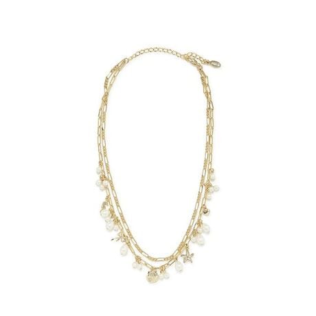 様々な海のモチーフと淡水風の形状のガラスパールを下げた、二連チェーンデザインの存在感のあるネックレス。ハートやリボンなどの愛らしいモチーフも盛り込まれた、FURFURらしいデザインです。
