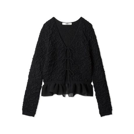 薄手で軽やかな着心地が魅力の一枚です。くしゅくしゅとした立体的な編み地が、さっと羽織るだけでスタイリングに奥行きを与えます。ほんのり透けるシアーな表情が涼やかで、春夏のレイヤードにも好相性です。裾にはシアー素材のペプラムをあしらい、動くたびに柔らかく揺れるフェミニンなアクセントをプラスしました。フロントはリボンで結ぶデザインで、甘さを調整しながら着こなしを楽しめます。デニムからワンピースまで幅広く合わせやすく、日常に軽やかなニュアンスを添えます。