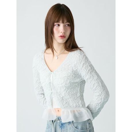 薄手で軽やかな着心地が魅力の一枚です。くしゅくしゅとした立体的な編み地が、さっと羽織るだけでスタイリングに奥行きを与えます。ほんのり透けるシアーな表情が涼やかで、春夏のレイヤードにも好相性です。裾にはシアー素材のペプラムをあしらい、動くたびに柔らかく揺れるフェミニンなアクセントをプラスしました。フロントはリボンで結ぶデザインで、甘さを調整しながら着こなしを楽しめます。デニムからワンピースまで幅広く合わせやすく、日常に軽やかなニュアンスを添えます。