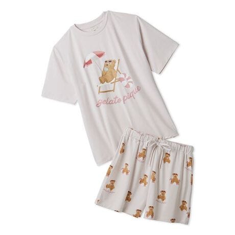 サングラス焼けしたお顔に思わず胸きゅん。夏をめいっぱい楽しむベアをテーマにした、ファミリーやカップルでお楽しみいただけるSUMMER BEARシリーズです。プールサイドでのんびり過ごすベアを描いたワンポイントTシャツと、総柄プリントのショートパンツをセットアップでご用意。サングラスや浮き輪、ロゴのカラフルな配色で、おうち時間にHAPPYな気分を添えます。柔らかなベア天竺の接触冷感素材を使用し、汗ばむ時期のお風呂上がりやおやすみの時間にもおすすめです。色はアイボリー、ピンク、ネイビーの3色展開。HOMME、KIDS、BABYとリンク・コーディネートしたり、ギフトにもおすすめのアイテムです。
