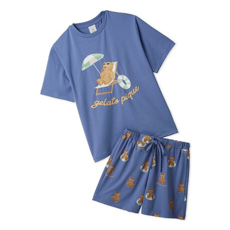 サングラス焼けしたお顔に思わず胸きゅん。夏をめいっぱい楽しむベアをテーマにした、ファミリーやカップルでお楽しみいただけるSUMMER BEARシリーズです。プールサイドでのんびり過ごすベアを描いたワンポイントTシャツと、総柄プリントのショートパンツをセットアップでご用意。サングラスや浮き輪、ロゴのカラフルな配色で、おうち時間にHAPPYな気分を添えます。柔らかなベア天竺の接触冷感素材を使用し、汗ばむ時期のお風呂上がりやおやすみの時間にもおすすめです。色はアイボリー、ピンク、ネイビーの3色展開。HOMME、KIDS、BABYとリンク・コーディネートしたり、ギフトにもおすすめのアイテムです。