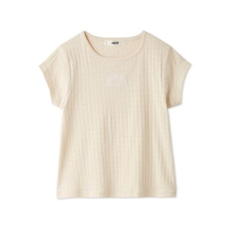 繊細なレース柄の刺繍を施したオリジナルワッペンがデザインのアクセントとなるTシャツです。コンパクトなサイズ感に、アイレット柄のカットソー生地を使用し、軽やかな印象に仕上げました。衿ぐりと袖口にはスカラップのピコミシンを施し、裾にはミニレースをあしらうことで、さりげないフェミニンさをプラス。シンプルながらも、スタイリングのポイントになる一枚です。