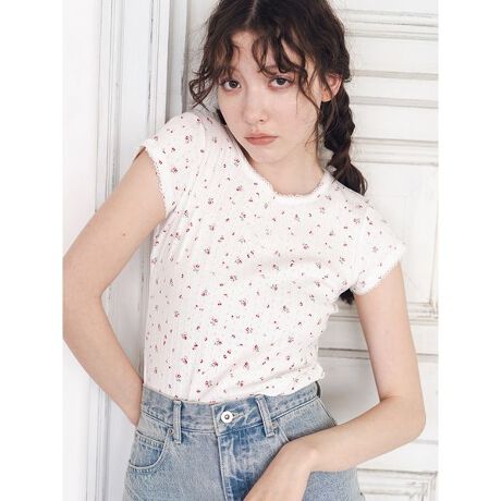 繊細なレース柄の刺繍を施したオリジナルワッペンがデザインのアクセントとなるTシャツです。コンパクトなサイズ感に、アイレット柄のカットソー生地を使用し、軽やかな印象に仕上げました。衿ぐりと袖口にはスカラップのピコミシンを施し、裾にはミニレースをあしらうことで、さりげないフェミニンさをプラス。シンプルながらも、スタイリングのポイントになる一枚です。