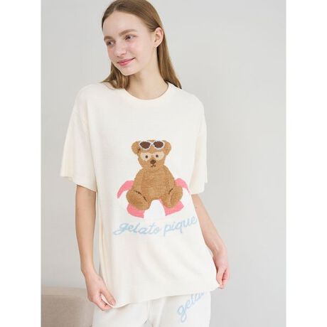サングラス焼けしたお顔に思わず胸きゅん。夏をめいっぱい楽しむベアをテーマにした、ファミリーやカップルでお楽しみいただけるSUMMER BEARシリーズです。浮き輪でひと休みしたり、アイスを食べているベアをジャガードで大きく描いた半袖ニットプルオーバー。柔らかな風合いの薄手ニットを使用しているので、エアコンの効いた夏のおうち時間にもちょうど良い1枚です。サングラスや浮き輪、ロゴのポップな配色が、HAPPYな気分を演出してくれます。色は浮き輪に乗ったベアを描いたアイボリーとミント、アイスを食べているベア柄のピンクの全3色。同シリーズのボトムや雑貨と合わせたり、HOMMEとペア・コーディネートも可能です。JUNIOR、KIDS、BABYとのリンク・コーディネートもお楽しみください。