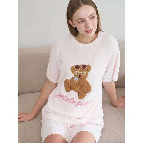 サングラス焼けしたお顔に思わず胸きゅん。夏をめいっぱい楽しむベアをテーマにした、ファミリーやカップルでお楽しみいただけるSUMMER BEARシリーズです。浮き輪でひと休みしたり、アイスを食べているベアをジャガードで大きく描いた半袖ニットプルオーバー。柔らかな風合いの薄手ニットを使用しているので、エアコンの効いた夏のおうち時間にもちょうど良い1枚です。サングラスや浮き輪、ロゴのポップな配色が、HAPPYな気分を演出してくれます。色は浮き輪に乗ったベアを描いたアイボリーとミント、アイスを食べているベア柄のピンクの全3色。同シリーズのボトムや雑貨と合わせたり、HOMMEとペア・コーディネートも可能です。JUNIOR、KIDS、BABYとのリンク・コーディネートもお楽しみください。