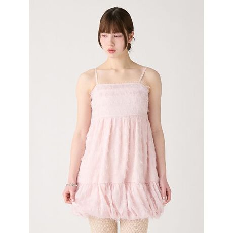 ラメ感のあるシアー生地にフリンジが付いた素材を使用。軽やかな透け感もありながら、裏地付きなので一枚で安心して着用できるワンピースです。肩紐調節が可能で後ろゴム仕様のため、様々なトップスとレイヤードして着用いただけます。インナー次第で幅広い季節に合わせた着こなしが楽しめるのも嬉しいポイント。スカートのボリュームシルエットがスタイリングに華やかさをプラスしてくれます。