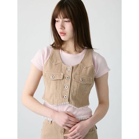 Gジャンのディティールを、あえて夏に映えるコンパクトなベストへと昇華。 加工を最小限に抑えた上品なデニム地で今年らしい気分に。裾にあしらわれた繊細なピコレースで、ワークウェアの無骨な印象に柔らかな彩りを添えました。バックスタイルにはウエスト調節が可能なベルトを配し、シルエットの美しさを追求。Gジャン特有のタフな佇まいを残しつつ、1枚で纏える絶妙なサイズ感にこだわりました。