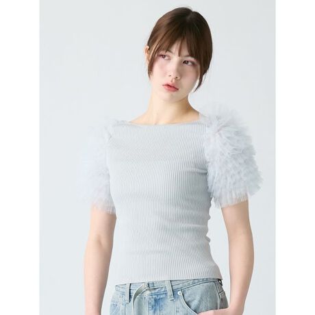 ふんわりとしたボリュームのチュールフリル袖が印象的な、夏仕様のニットトップスです。繊細なチュール素材を使用し、身頃はリブ編みのすっきりとしたシルエットで、大人の女性が取り入れやすいバランスに仕上げています。後ろ開きの肌見せデザインで甘さを程よく抑え、デニム合わせでも上品な印象に着こなせる一着です。前後どちらでも着用可能で、雰囲気を変えてお楽しみいただけます。