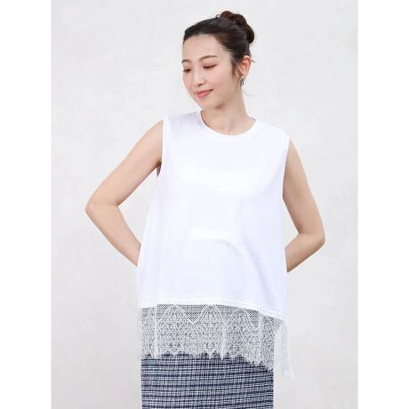 シンプルな中にさりげない華やかさをプラスした、レースドッキングトップス。