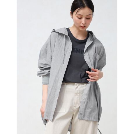 ・ボタンを一つ開けてスキッパーシャツのように着用いただくと、顔周りに抜け感がありつつ、フードのラフさが今シーズンらしい一着に。