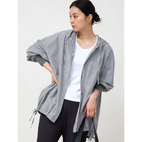・ボタンを一つ開けてスキッパーシャツのように着用いただくと、顔周りに抜け感がありつつ、フードのラフさが今シーズンらしい一着に。