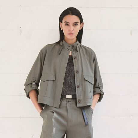 首元のベルト裏やコンシールファスナーの基布隠しには、繊細な光沢をもつテープをあしらい、ミリタリー由来のディテールに上品なニュアンスを添えています。