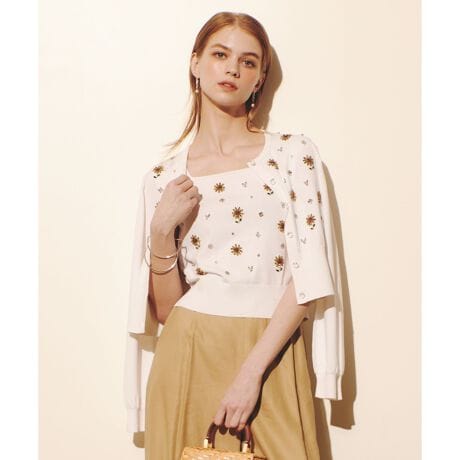 シーズン気分を盛り上げる「ひまわり」モチーフをキラキラのビジューで表現したカーディガン。