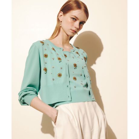 シーズン気分を盛り上げる「ひまわり」モチーフをキラキラのビジューで表現したカーディガン。