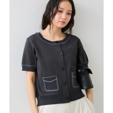 ステッチがアクセントになったクルーネックのニットカーディガン。