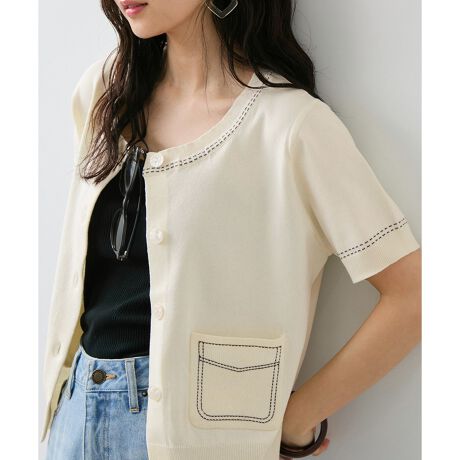 ステッチがアクセントになったクルーネックのニットカーディガン。
