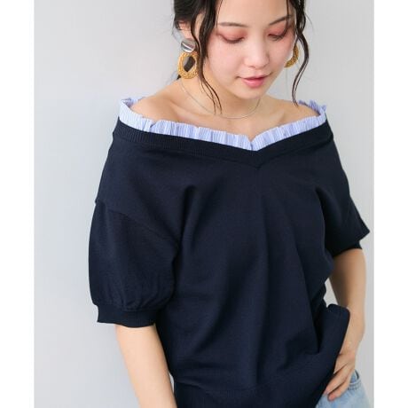 ネックにシャツ素材でフリルをドッキングした華やかな印象のニットトップス。