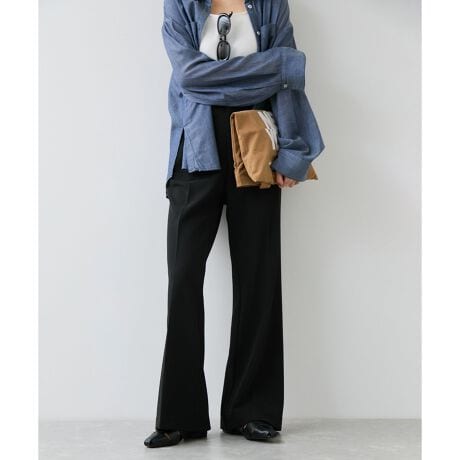 きれいな細身のフレアシルエット。ヒップ、太ももを拾いすぎず、美しいシルエットになるよう設定しました。ウエストは後ろの脇側にだけゴムにしており伸縮性があります。ヒップにはフェイクのフラップポケット付きでインナーの当たりを軽減。