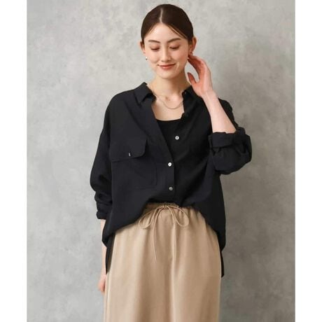 程よいハリとしなやかさ、さらにシアー感を併せ持つツイル素材を使用したシャツ。素材のほどよい反発感により、メンズライクなゆったりとしたサイズ感でもルーズに見えず、立体的なフォルムをキープします。 大きめのフラップポケットがアクセントになり、ワークテイストを感じさせつつも、シアーな素材感で軽やかな印象に。羽織としても活躍し、フロントをインすれば女性らしいニュアンスのある着こなしも楽しめます。 長袖でも重く見えず、袖をラフにたくし上げた抜け感のあるスタイリングがおすすめ。シーズンを通して幅広く着回せる一着です。40サイズは限定店舗展開です。