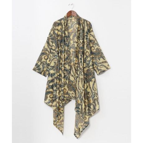 [型番:IAC-6153-2026]ペイズリー柄を大胆にプリントした変形カーディガン。袖タブ付きでアレンジ可能。風通しの良いインド綿素材で、ユニセックスに着こなせる一枚。