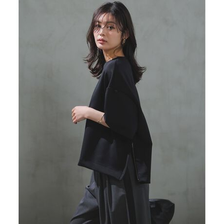 ■デザインゆったりとしたクロップドシルエットが、今年らしいバランスを演出する一枚。シンプルなTシャツデザインながら、ほんのり光沢のある素材できれいめな印象に仕上げました。サイドにあしらったゴールドジップがさりげないアクセントとなり、軽やかな抜け感をプラス。身頃やアームホールにゆとりを持たせているため風通しが良く、暑い季節も快適に着用いただけます。同素材のIラインスカートと合わせたセットアップスタイルもおすすめです。