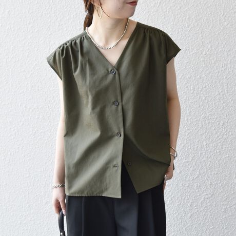 肩と背中のギャザーが目を惹くブラウス。