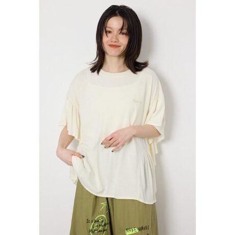 ■ポイントカジュアルなカットソー素材に、表面感のある柔らかなフリル袖を組み合わせたレディライクな切替プルオーバー。ゆったりシルエットで体のラインを拾わず、ラクな着心地ながらきれい見えするのが嬉しいポイントです。フリルが自然に縦のラインを作ってくれて、さりげなく体型カバーを叶えてくれます。■ディテール表面感のあるレーヨン素材のフリル部分は、落ち感があるのでボリュームがですぎないのがポイント。涼し気な雰囲気も演出してくれます。■スタイリングレディライクなデザインなので、カジュアルなフルレングスデニムやカーゴパンツなどとの相性が抜群です。■生地落ち感があり肌触りの良いレーヨン楊柳素材と、21/-TC OE天竺を切り替えて使用しています。左胸の刺繍には光沢のある糸を使用しています。■透け感:ややあり■裏 地:なし■伸縮性:ややあり■光沢感:ややあり※お取り扱い上のご注意家庭洗濯により、シワ感が変化する場合があります。[注意事項]※画像の商品はサンプルです。実際の商品と仕様、加工が若干異なる場合があります。※画像の商品は光の照射や角度、お使いのモニター環境により、実物と色味が異なる場合がございます。※着用、お取り扱いの際は、アテンションタグをご確認ください。