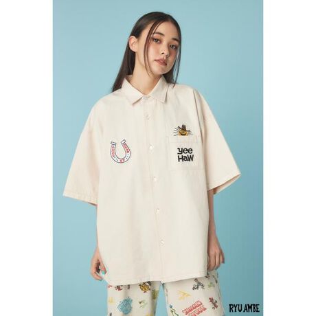 ■ポイントキャラクターデザイナーRyu Ambeコラボアイテムのシャツ。■ディティールフロントには蹄のモチーフのワッペンとサンパンチョがポケットに刺繍が施されています。バックには今回RYUさんが書き起こしたキャラクターたちが集合したアートが刺繍で表現されています。今回だけのために作られた豪華なスペシャルアイテム。ユニセックスで着用できます。■スタイリングデニムやチノパンツなどのベーシックなアイテムはもちろん、旬のカラーパンツやロングスカートなどとも相性抜群。■生地後身頃刺繍は11色使いで振り刺繍と畳刺繍で埋め尽くしています。左胸ポケット、ポケット下にも刺繍があります。右ポケットはワッペン付きで、BLUは製品STONEBIOブリーチ加工、その他は製品STONEBIO加工仕上げです。■透け感:なし■光沢感:なし■伸縮性:なし■裏 地:なし[注意事項]※画像の商品はサンプルです。実際の商品と仕様、加工が若干異なる場合があります。※画像の商品は光の照射や角度、お使いのモニター環境により、実物と色味が異なる場合がございます。※着用、お取り扱いの際は、アテンションタグをご確認ください。