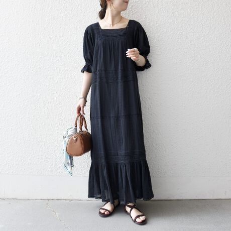 顔まわりをすっきり見せてくれるスクエアネックもポイントです。