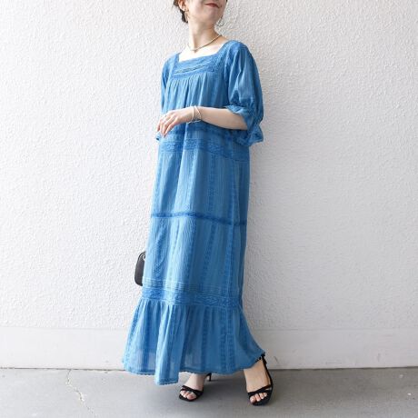襟元のレースがアンティークな雰囲気を演出する、マキシ丈ワンピース。