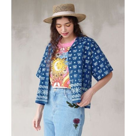 [型番:IDS-6120-2026]短丈でバランスが取りやすい開襟シャツ。インディゴの深みあるカラーと繊細なブロックプリントが調和し、カジュアルにも映える万能アイテム。