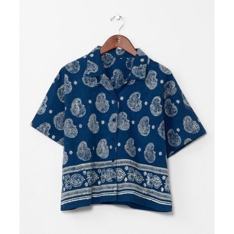 [型番:IDS-6120-2026]短丈でバランスが取りやすい開襟シャツ。インディゴの深みあるカラーと繊細なブロックプリントが調和し、カジュアルにも映える万能アイテム。