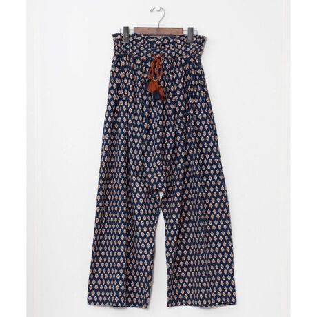 インドの民族服「シャルワールパンツ」から着想を得た綿パンツ。風通しのよい素材に、ウエストフリルとバグループリント風の柄が個性的。