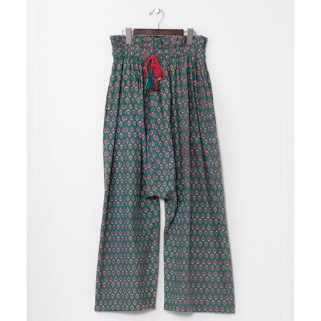 [型番:IAC-6158-2026]インドの民族服「シャルワールパンツ」から着想を得た綿パンツ。風通しのよい素材に、ウエストフリルとバグループリント風の柄が個性的。