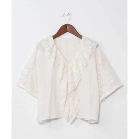 [型番:IAC-6155-2026]3種のレースと刺しゅう生地を贅沢に使用したトップス。襟元からフロントにかけてのフリルが目を惹く華やかなデザイン。