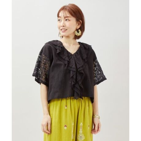 [型番:IAC-6155-2026]3種のレースと刺しゅう生地を贅沢に使用したトップス。襟元からフロントにかけてのフリルが目を惹く華やかなデザイン。