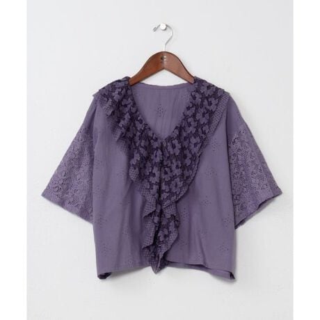 [型番:IAC-6155-2026]3種のレースと刺しゅう生地を贅沢に使用したトップス。襟元からフロントにかけてのフリルが目を惹く華やかなデザイン。