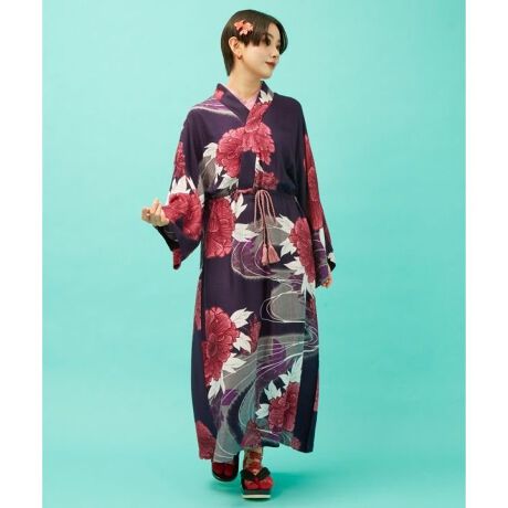 [型番:7IA-6202-2026]流水と水面に浮かぶ牡丹を描いた華やかなワンピース。半衿付きで着物のような雰囲気を楽しめる形に仕上げました。やわらかく落ち感のあるレーヨン素材がきれいなシルエットを生み、すとんと着るだけで和の装いが完成します。