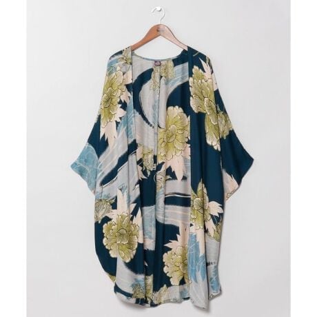 [型番:7IA-6203-2026]流水と水面に浮かぶ牡丹を描いた振袖風羽織。ゆったりとした袖が印象的で、さっと羽織るだけで華やかな雰囲気に。やわらかく落ち感のあるレーヨン素材を使用し、UVカット加工も施した実用的な一着です。UVカット加工
