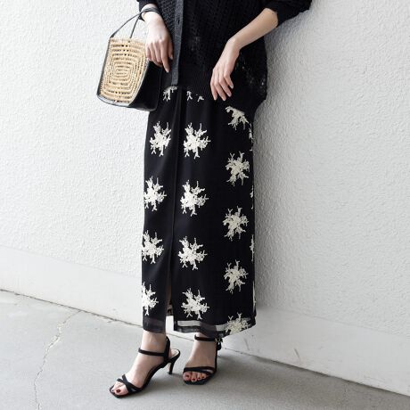 細いコード状の紐を使って立体的なフラワーモチーフを表現した、華やかなタイトスカート。